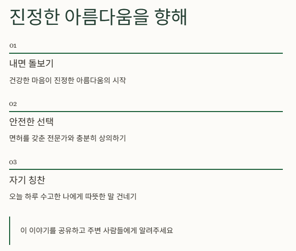 단순히 외모를 가꾸는 것을 넘어 나의 내면을 건강하게 돌보고 안전한 선택을 하는 것이 얼마나 소중한지 다시금 깨닫게 됩니다.