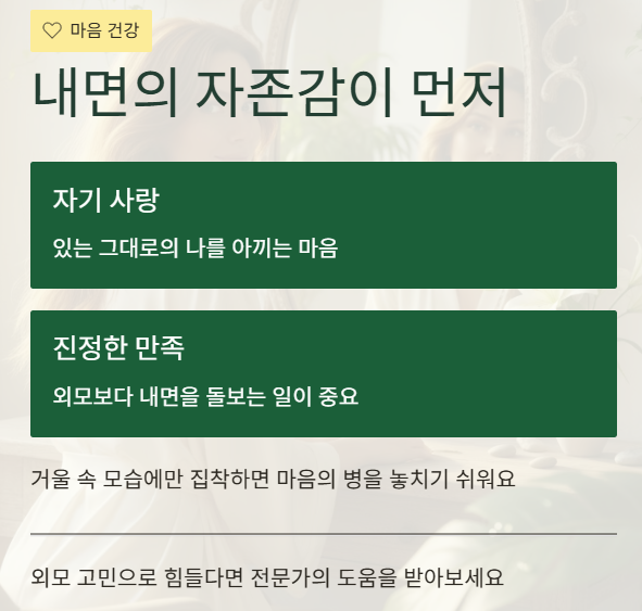 거울 속에 비친 모습에만 집착하다 보면 정작 중요한 마음의 병을 놓치기 쉽거든요.